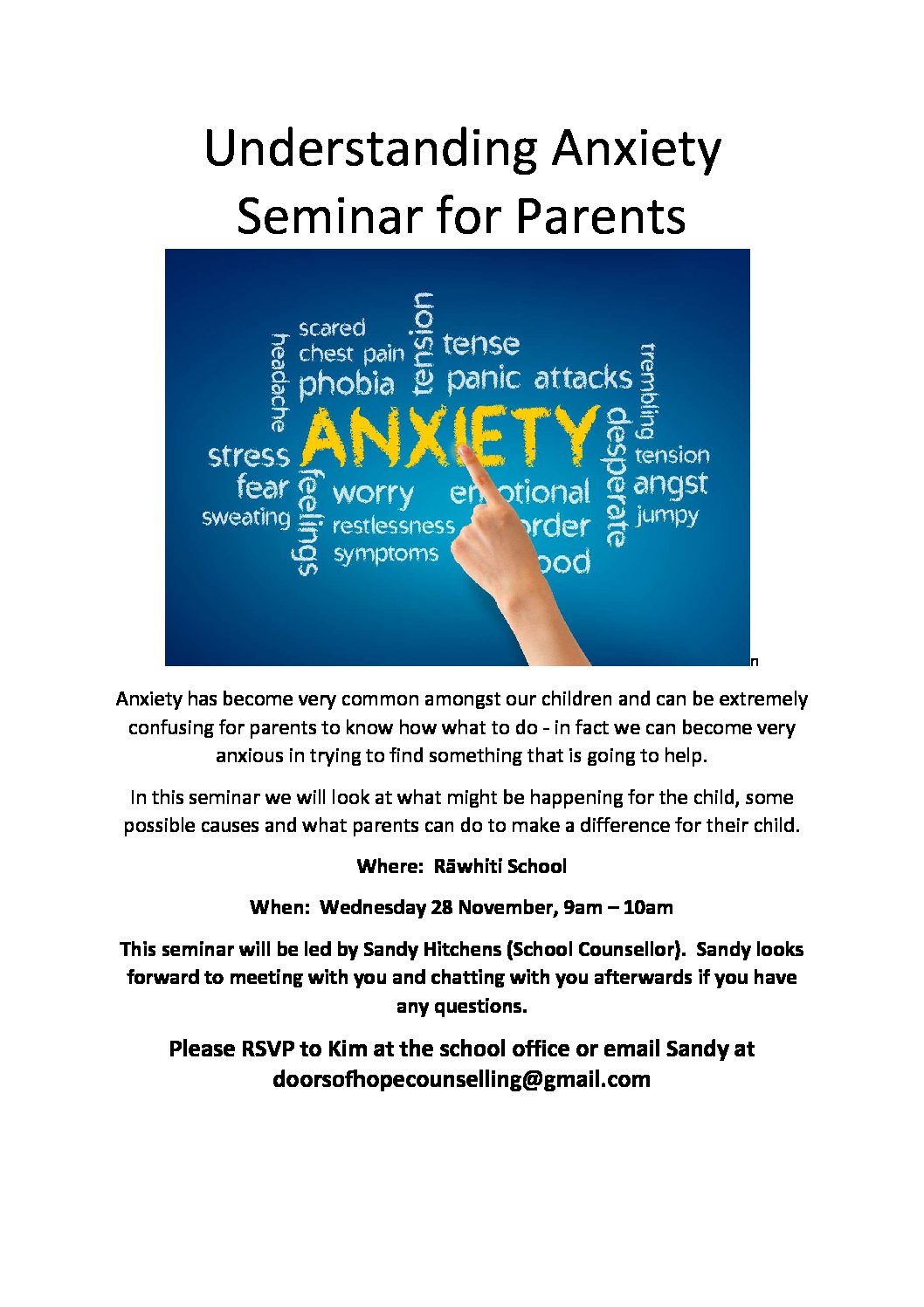 Please RSVP to Kim at the school office or email Sandy at doorsofhopecounselling@gmail.com
